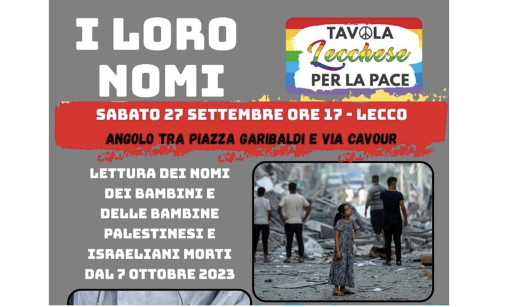 Per tenere alta l’attenzione sul genocidio del popolo palestinese, che finora è costato la vita a più 20.000 minori, con la Tavola lecchese per la Pace abbiamo organizzato una maratona di LETTURA DEI NOMI DI BAMBINE E BAMBINI UCCISI nella Striscia di Gaza e in Israele dal 7 ottobre 2023.